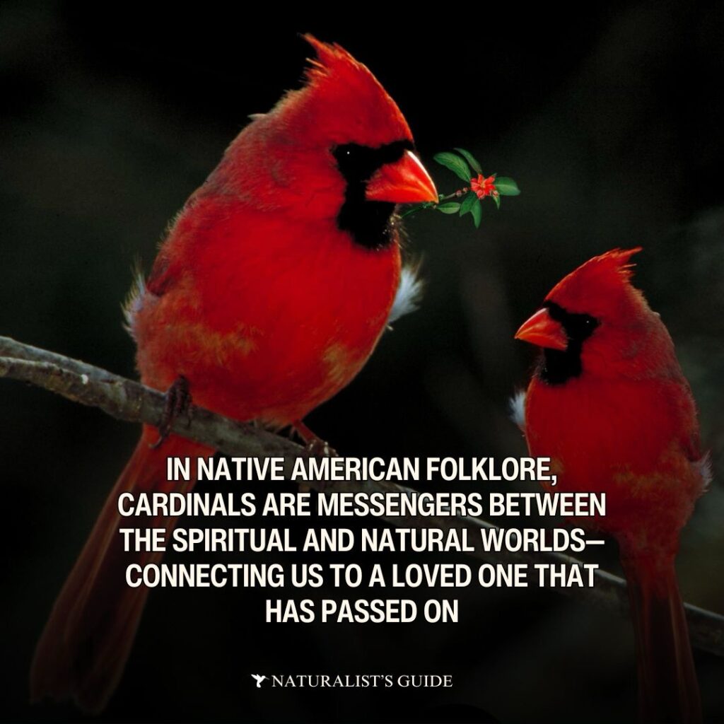 Many Native American tribes associate the cardinal with the spiritual and natural worlds—such as being the daughter of the Sun or that they serve as matchmakers for lovers. Cardinals are believed to be messengers between the spiritual and natural worlds—often connecting us to a loved one that has passed.